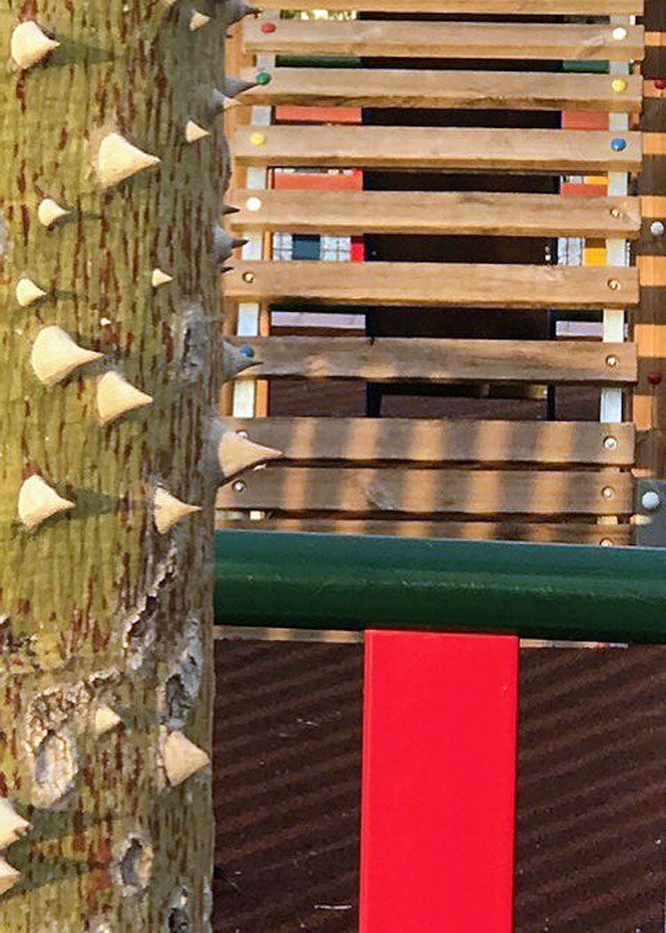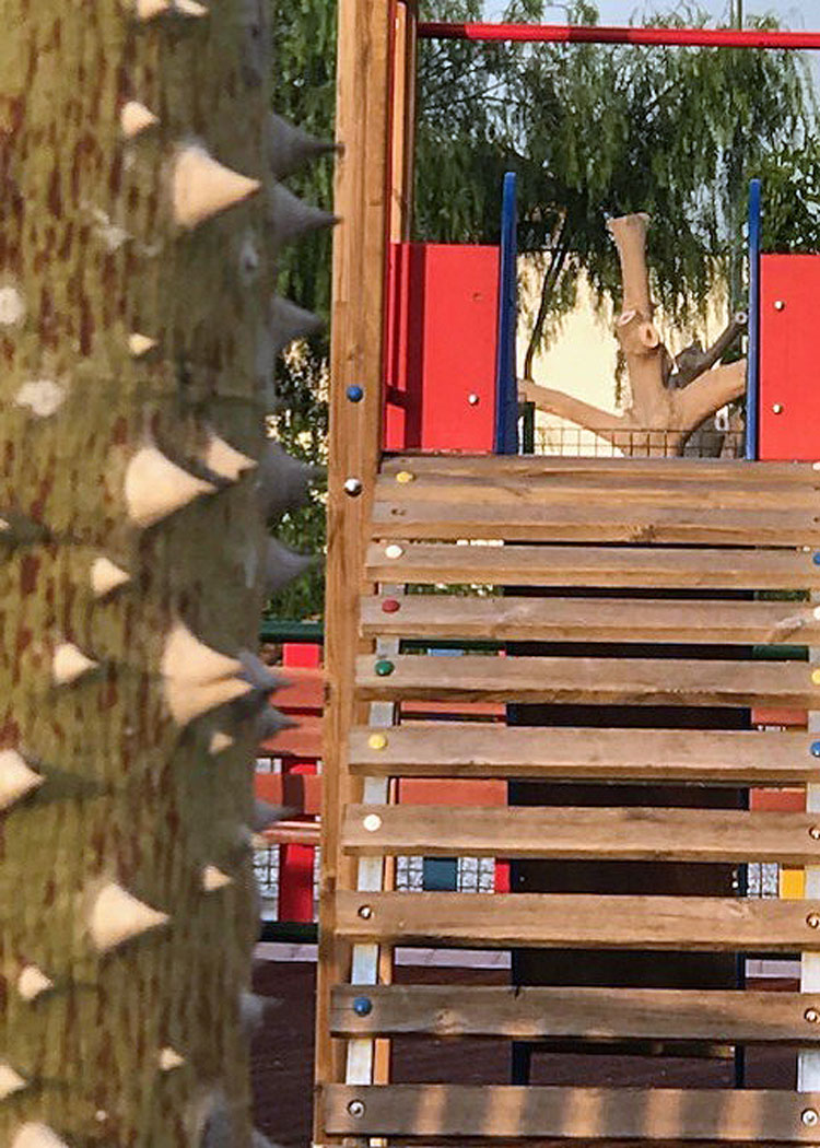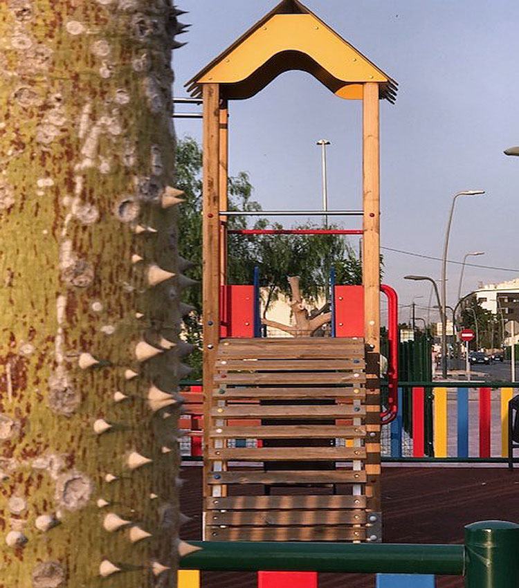 Arboles con púas afiladas junto a parque infantil en Alcantarilla