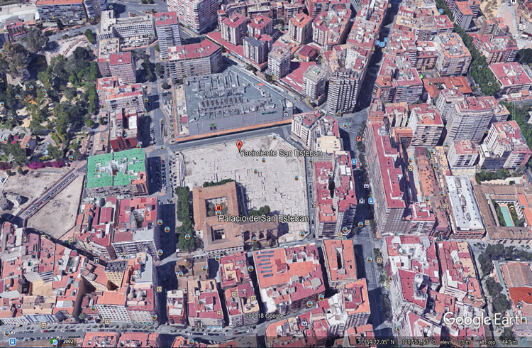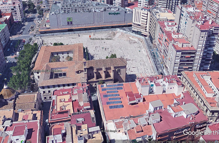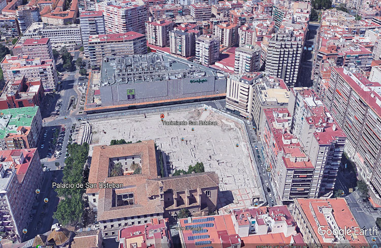 - Foto de Google Earth del yacimiento de San Esteban, con el Palacio de San Esteban minándole espacio en su contorno.