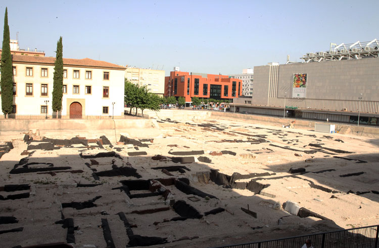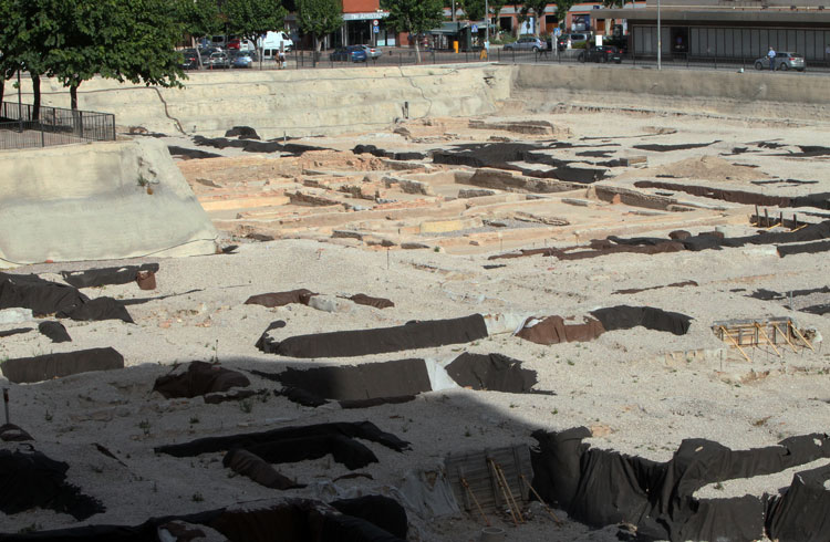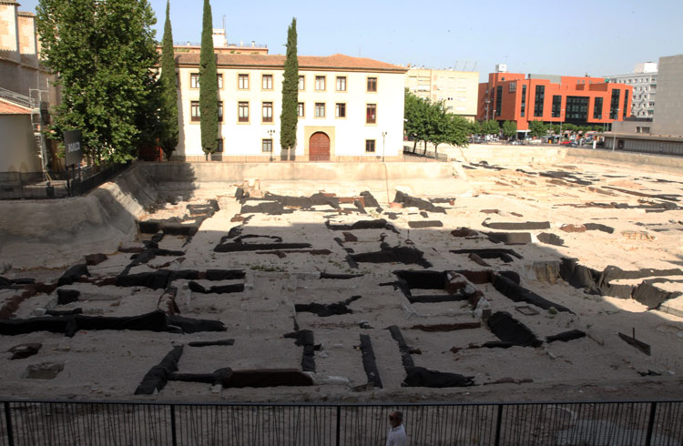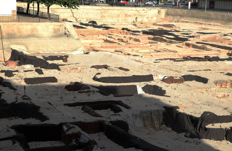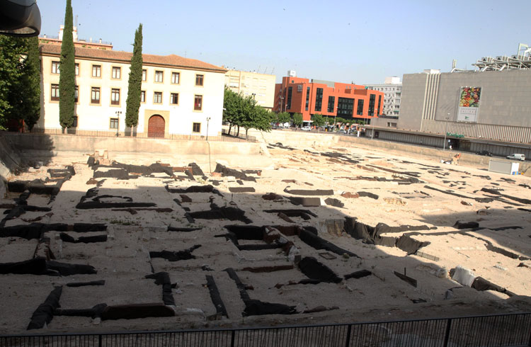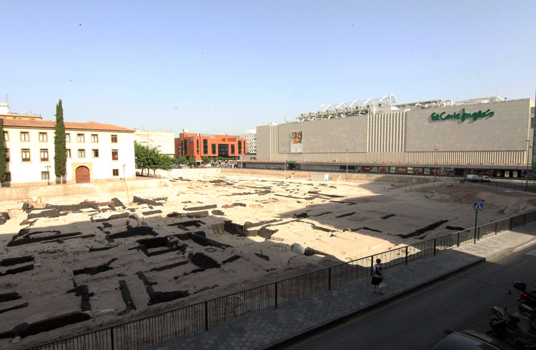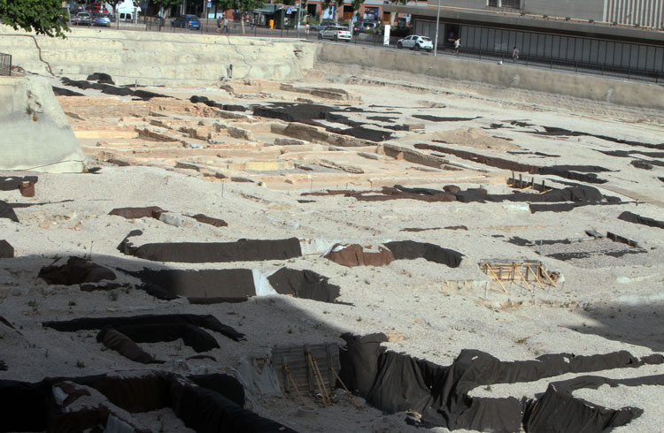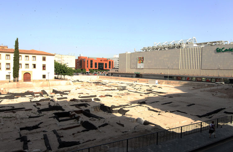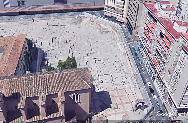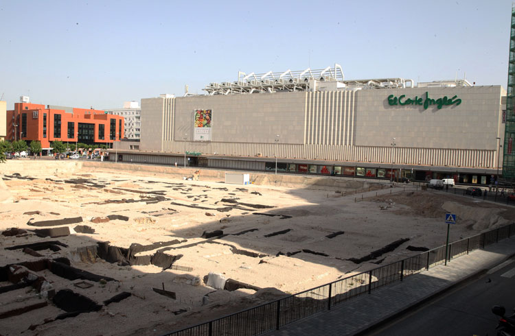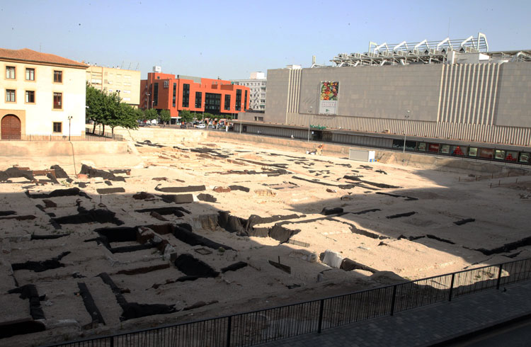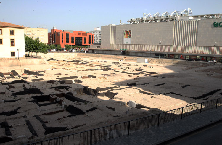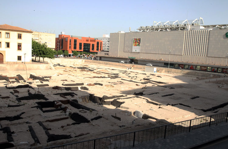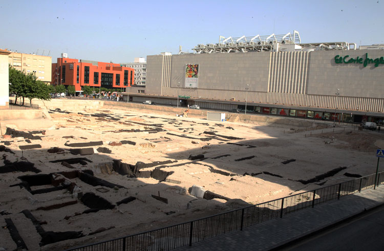 Vista general del yacimiento de San Esteban de Murcia, con El Corte Ingles y el Palacio de San Esteban, como testigos. Durante la construcción del centro comercial allá por 1975, aparecieron importantes restos, que fueron sepultados y desaparecidos misteriosamente. Foto Pepe Riquelme.