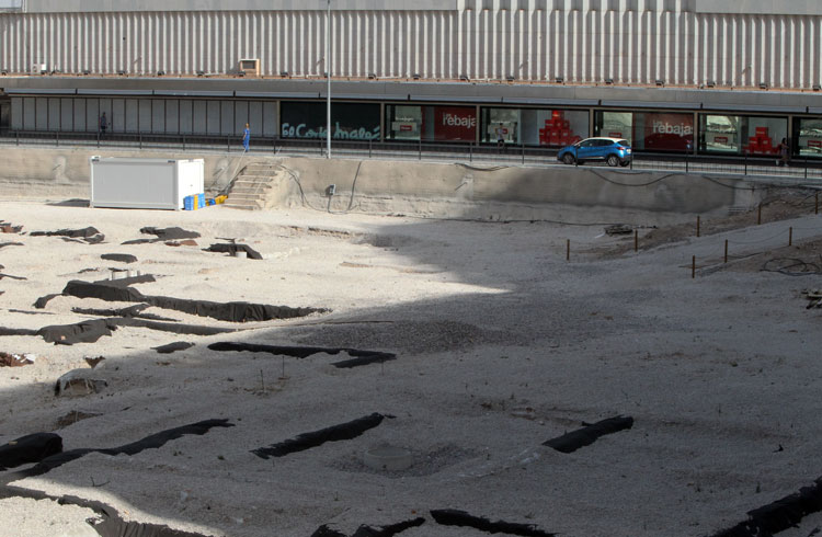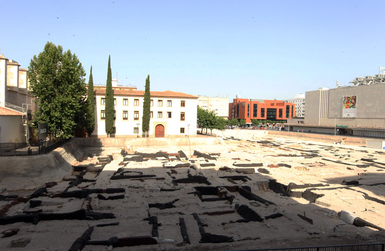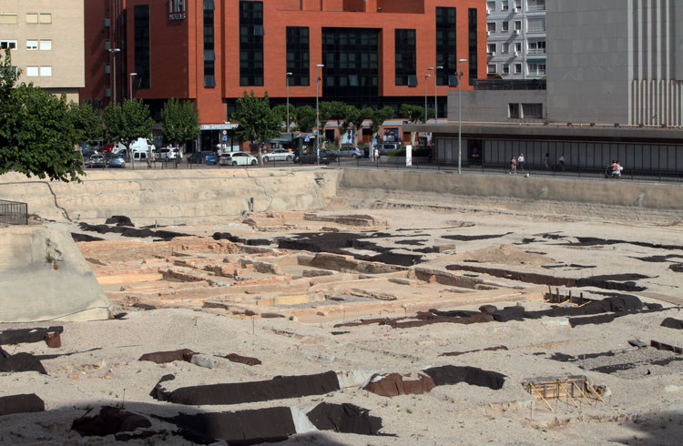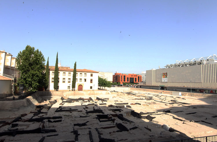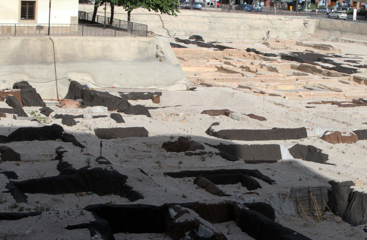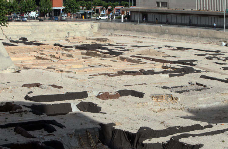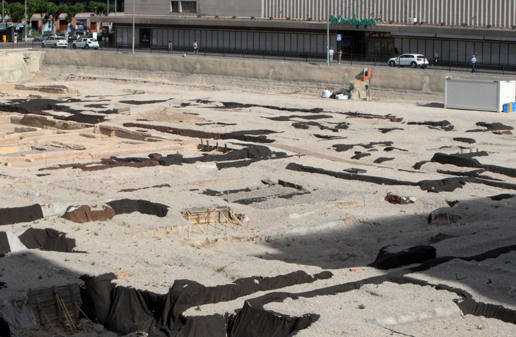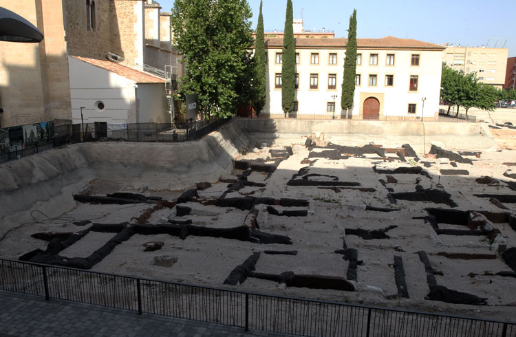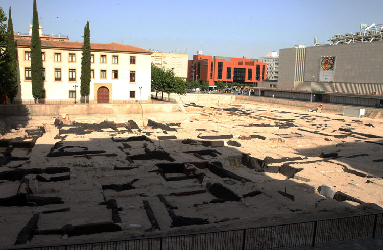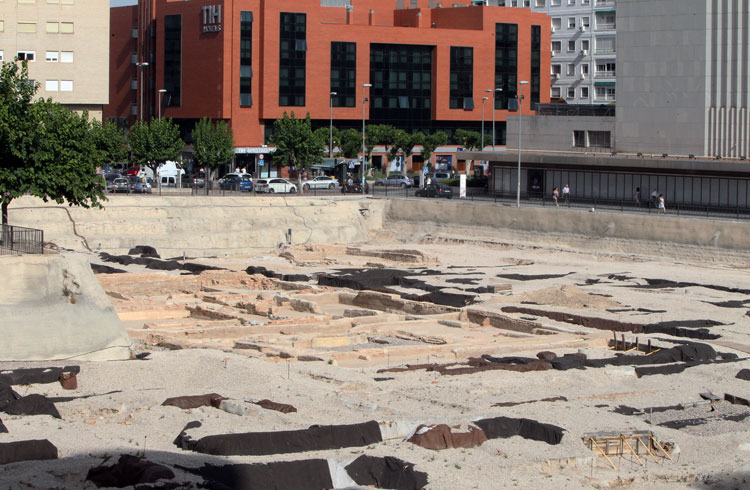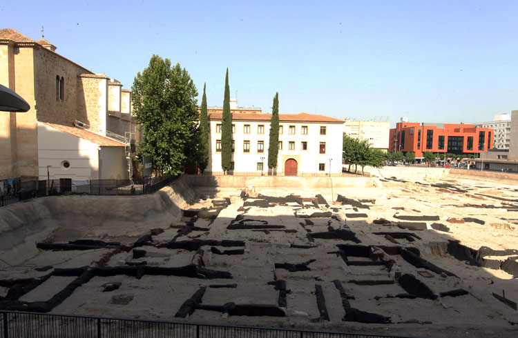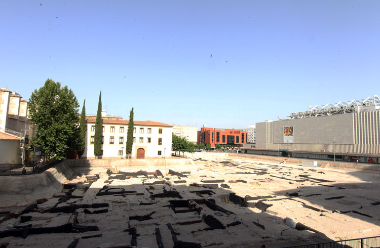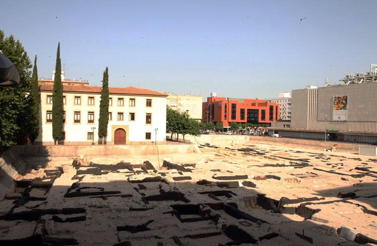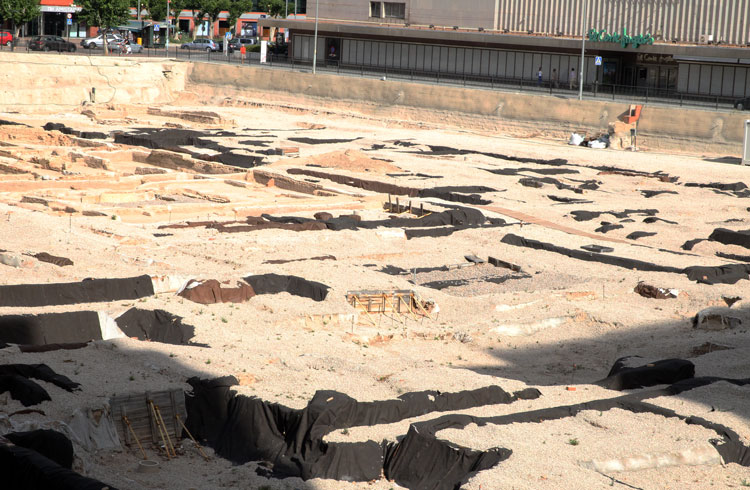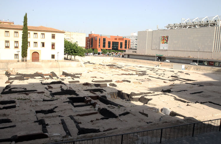 Vista general del yacimiento de San Esteban de Murcia, con El Corte Ingles y el Palacio de San Esteban, como testigos. Durante la construcción del centro comercial allá por 1975, aparecieron importantes restos, que fueron sepultados y desaparecidos misteriosamente. Foto Pepe Riquelme.