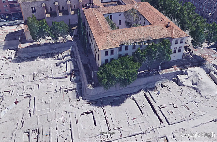 Solo hay que mirar la foto aérea de Google Earth para darse cuenta, o tomada desde cualquier edificio próximo, para observar que el yacimiento con las ruinas, y el Palacio de San Esteban en una esquina del cuadrado, es una prolongación y darse cuenta de lo que esconde debajo el Palacio.