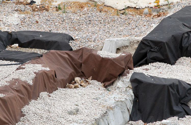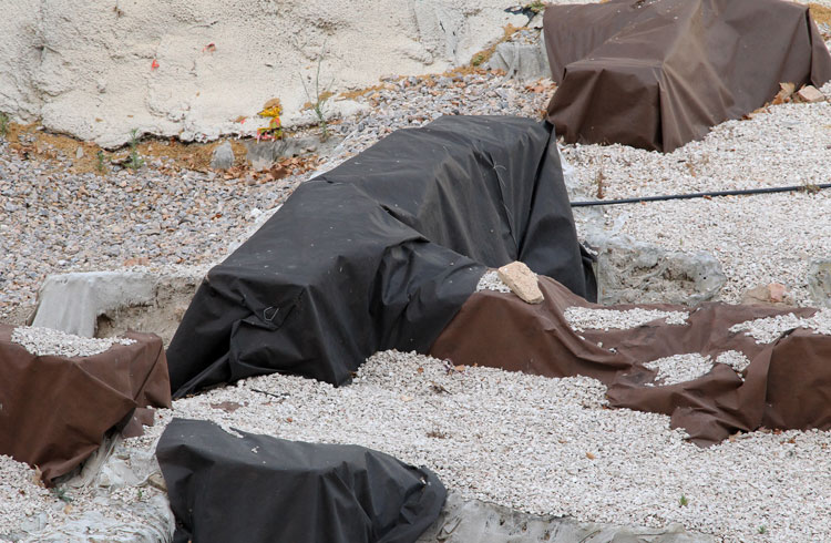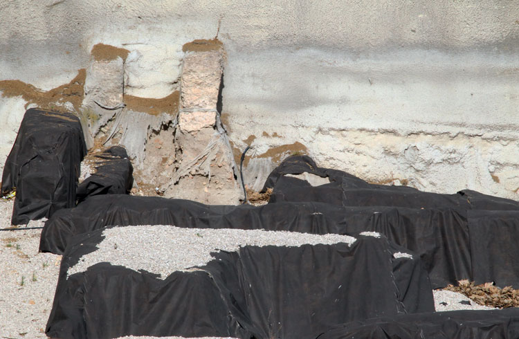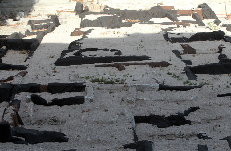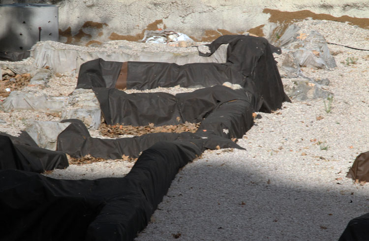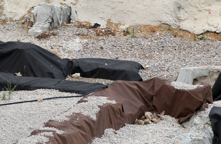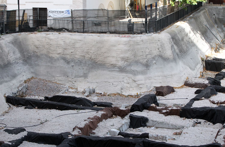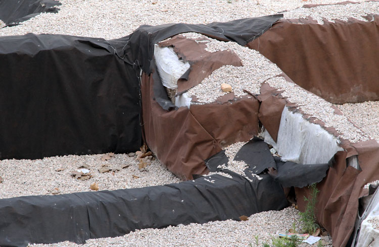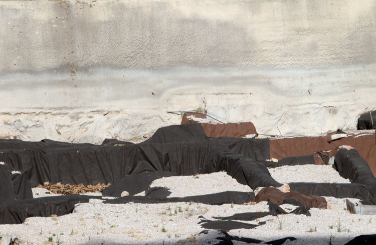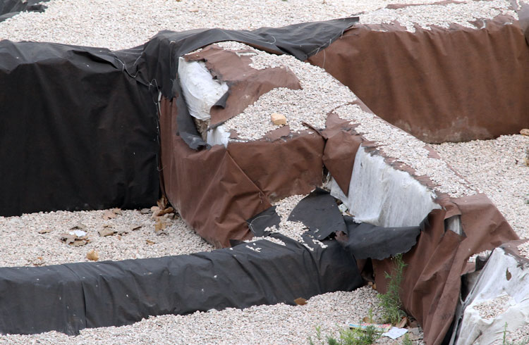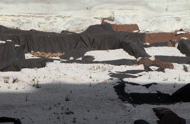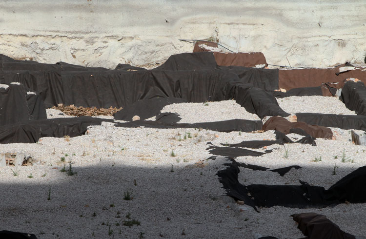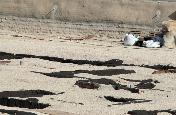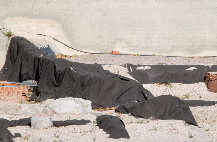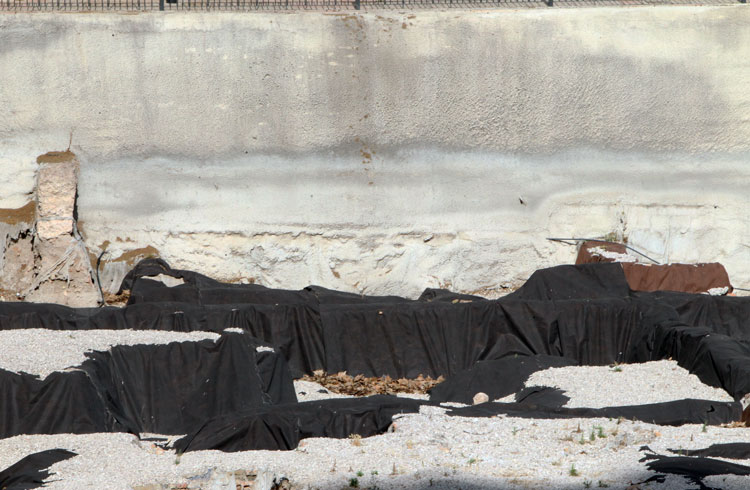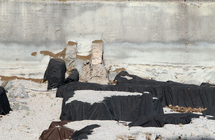 El yacimiento de San Esteban en Murcia, años tapado con plásticos. Y los trabajos de restauración duran y duran, y nadie sabe cuando acabaran ni el uso último que se le dará. Mientras tanto las hojas secas, y las bolsas de gusanitos se acumulan. Foto Pepe Riquelme.