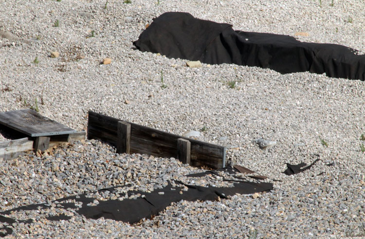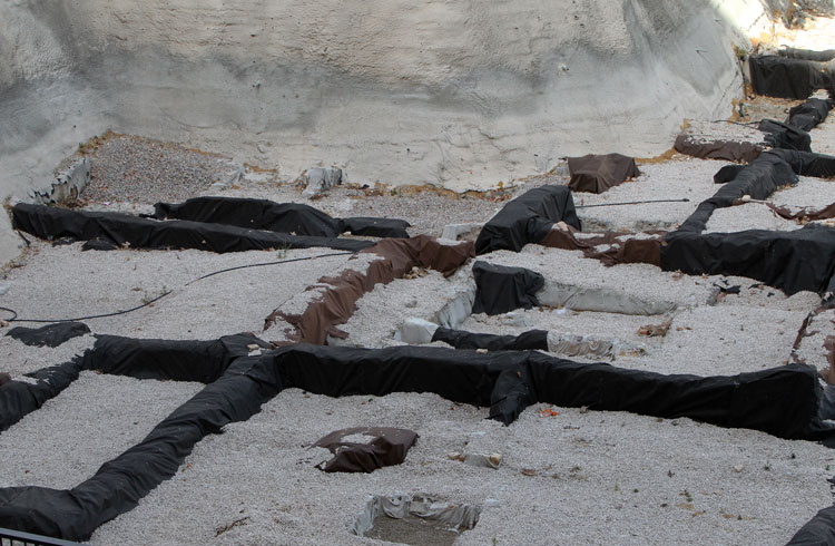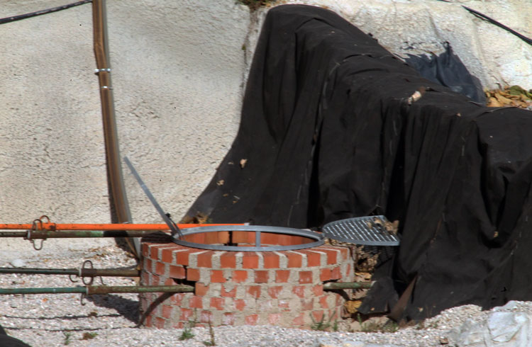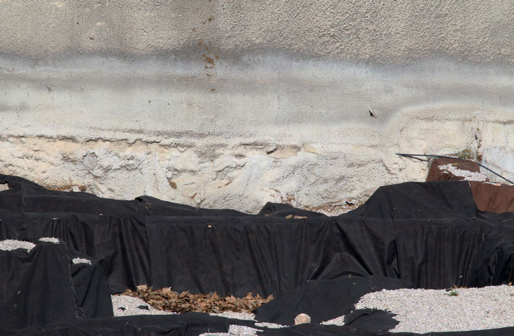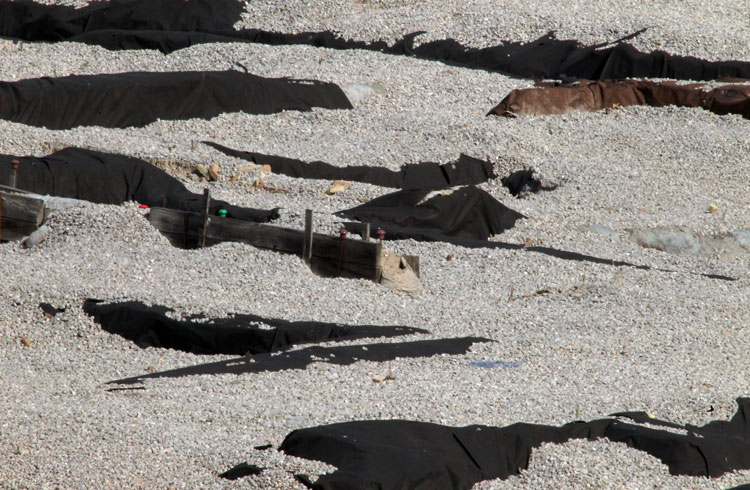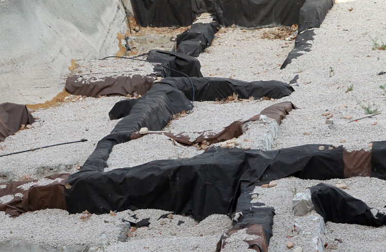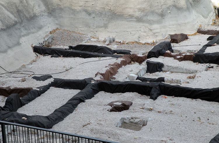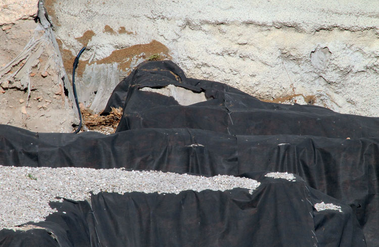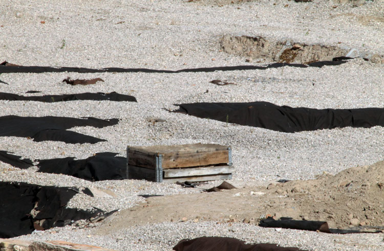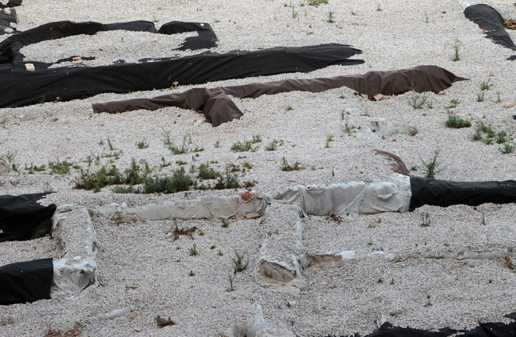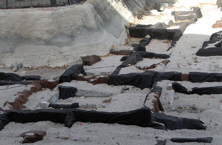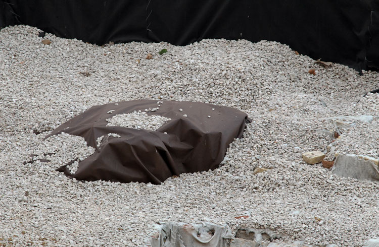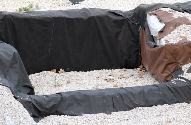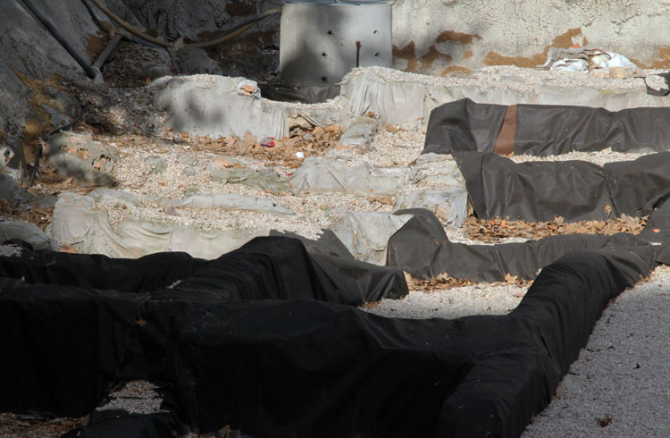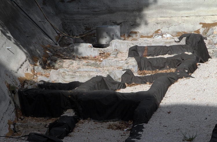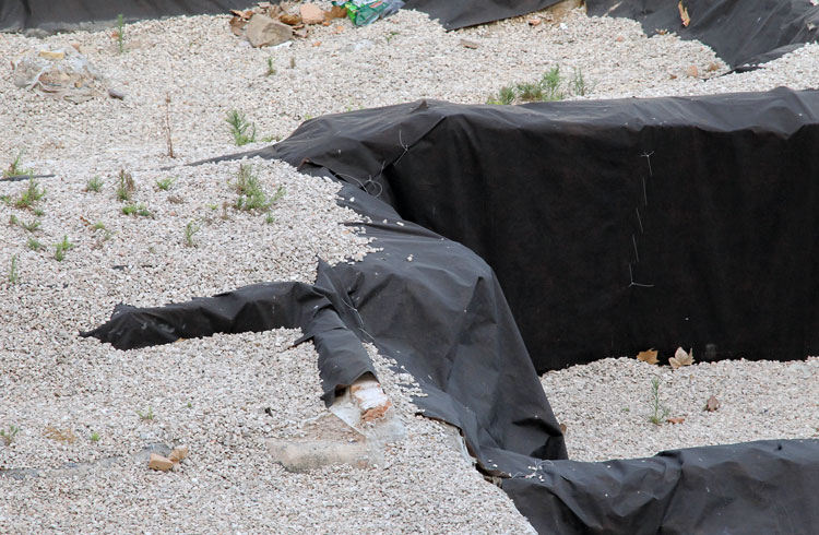 El yacimiento de San Esteban en Murcia, años tapado con plásticos. Y los trabajos de restauración duran y duran, y nadie sabe cuando acabaran ni el uso último que se le dará. Mientras tanto las hojas secas, y las bolsas de gusanitos se acumulan. Foto Pepe Riquelme.