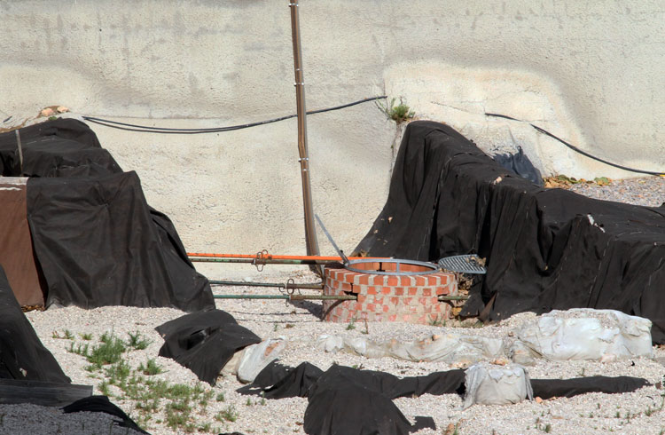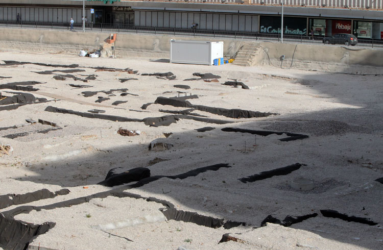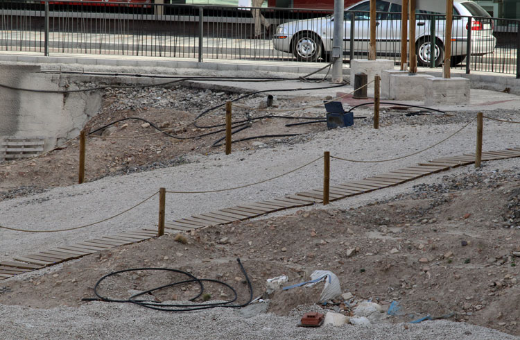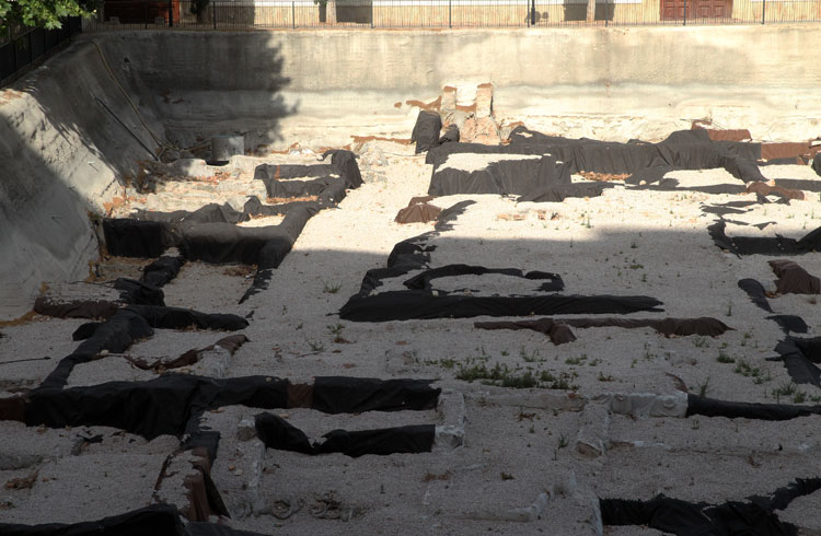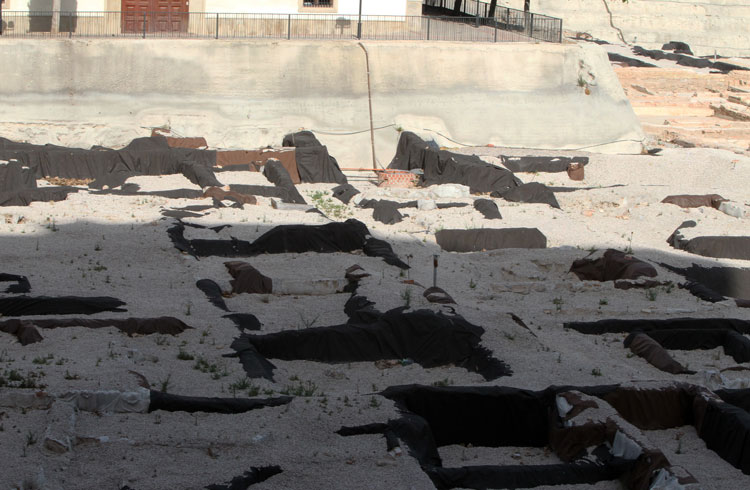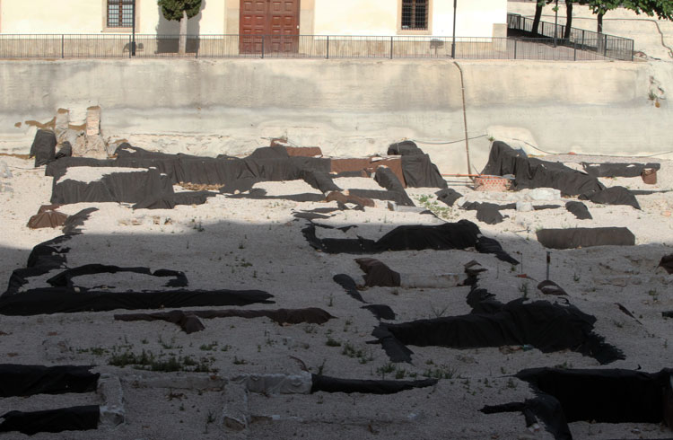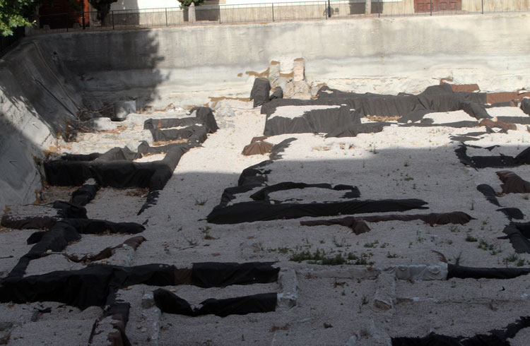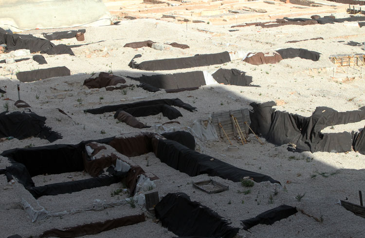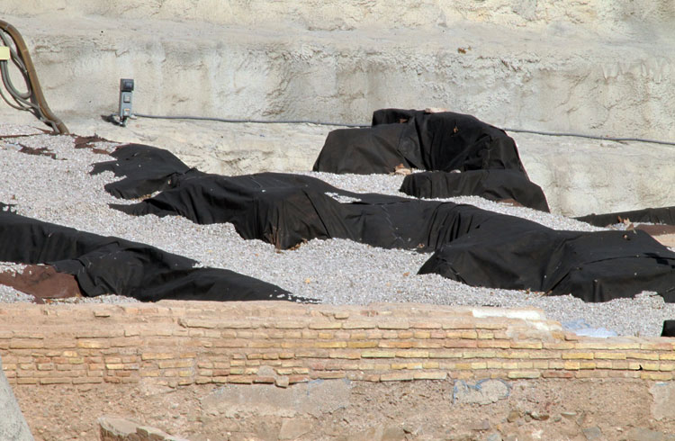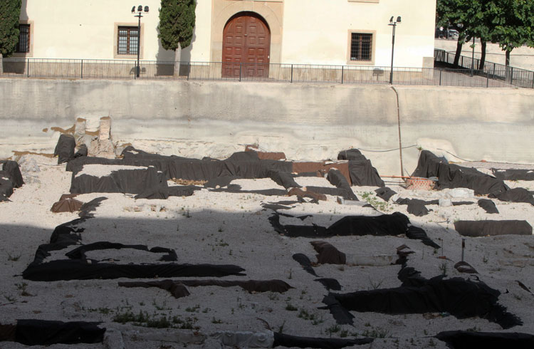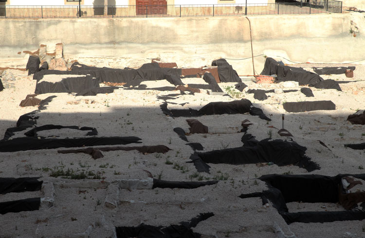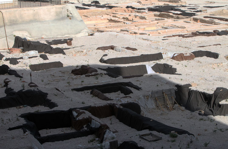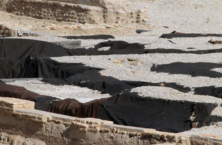- El yacimiento de San Esteban en Murcia, años tapado con plásticos. Y los trabajos de restauración duran y duran, y nadie sabe cuando acabaran ni el uso último que se le dará. Mientras tanto las hojas secas, y las bolsas de gusanitos se acumulan. Foto Pepe Riquelme.