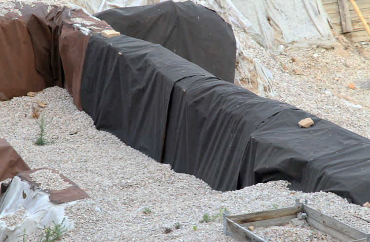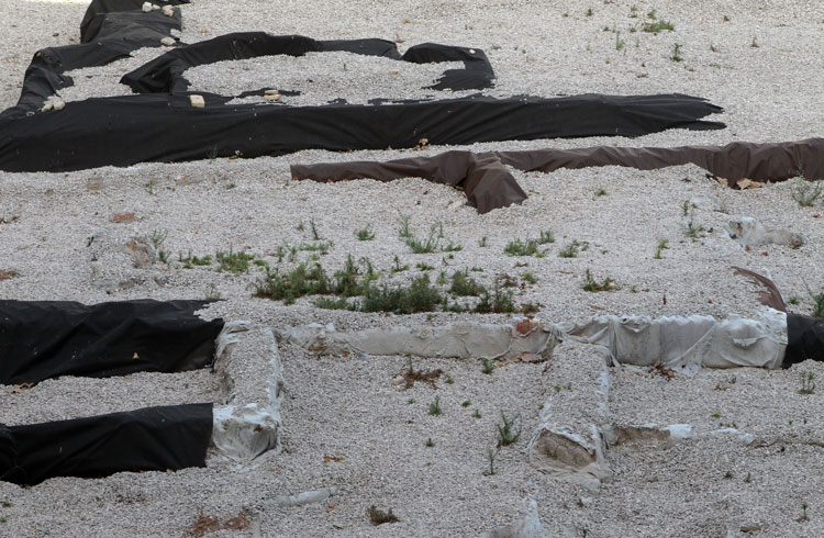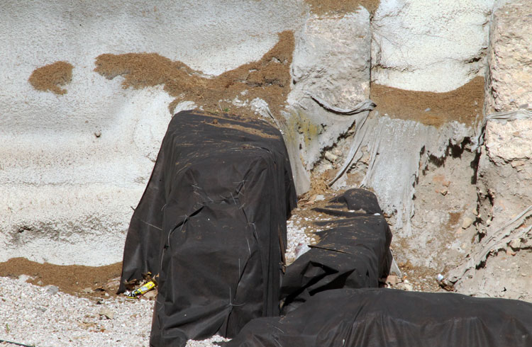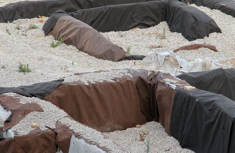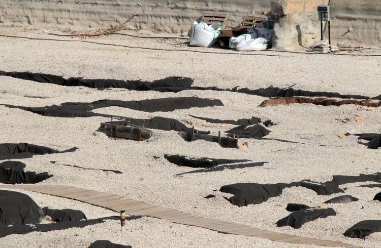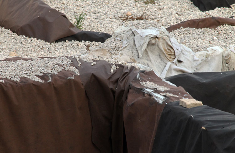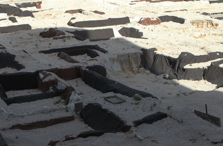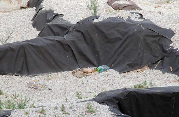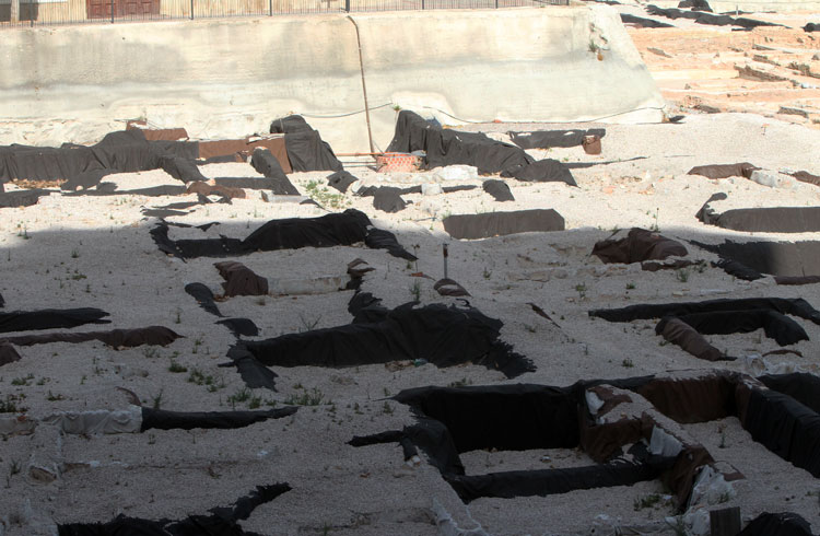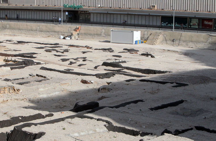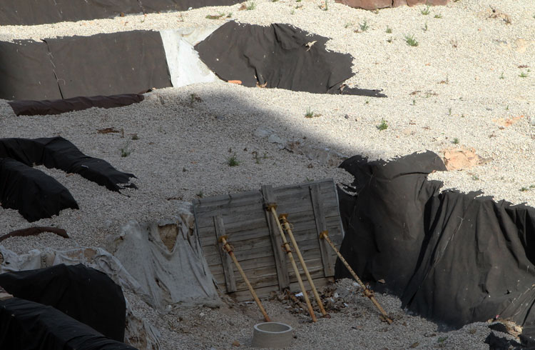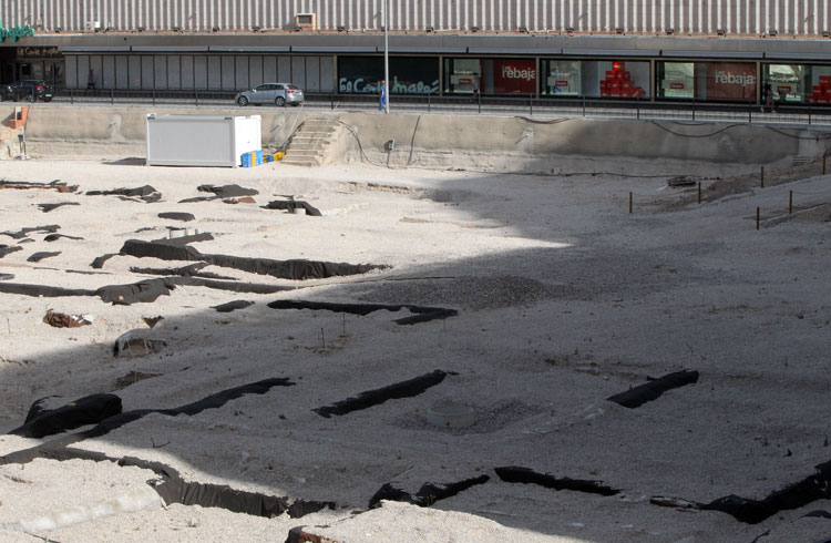 - El yacimiento de San Esteban en Murcia, años tapado con plásticos. Y los trabajos de restauración duran y duran, y nadie sabe cuando acabaran ni el uso último que se le dará. Mientras tanto las hojas secas, y las bolsas de gusanitos se acumulan. Foto Pepe Riquelme.
