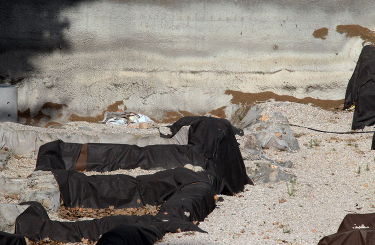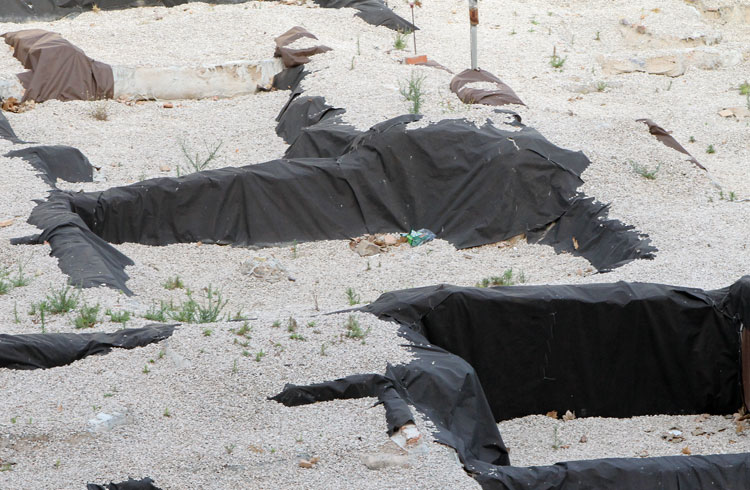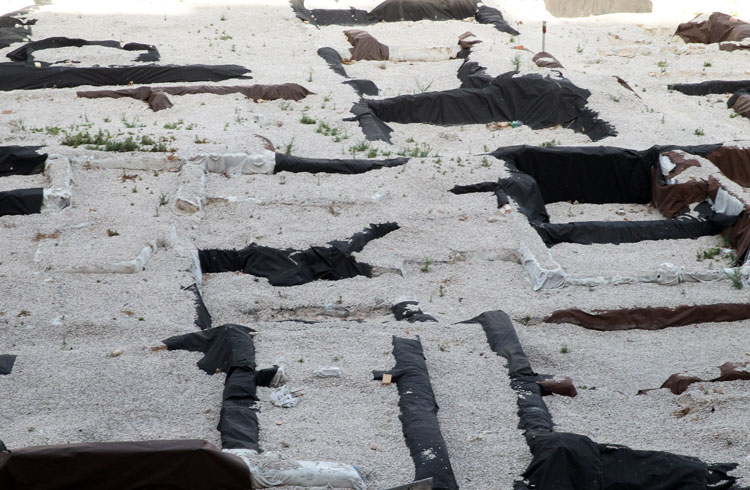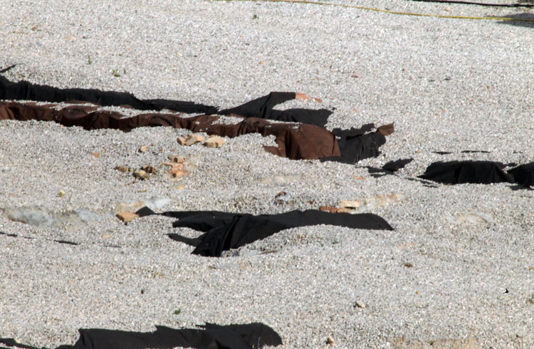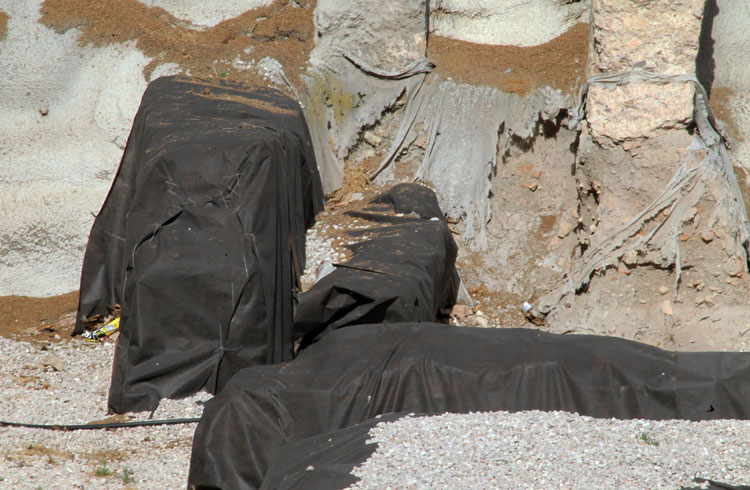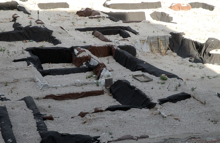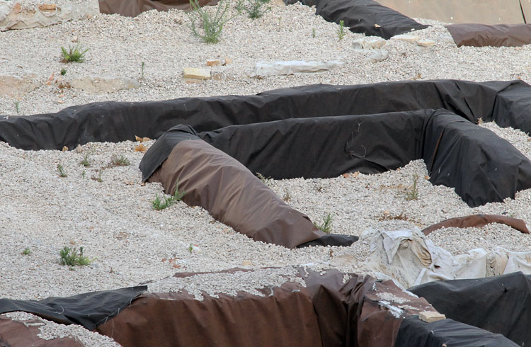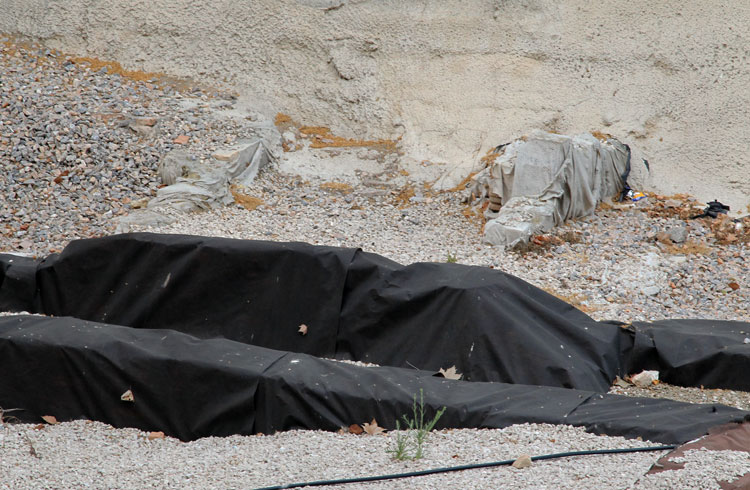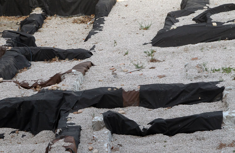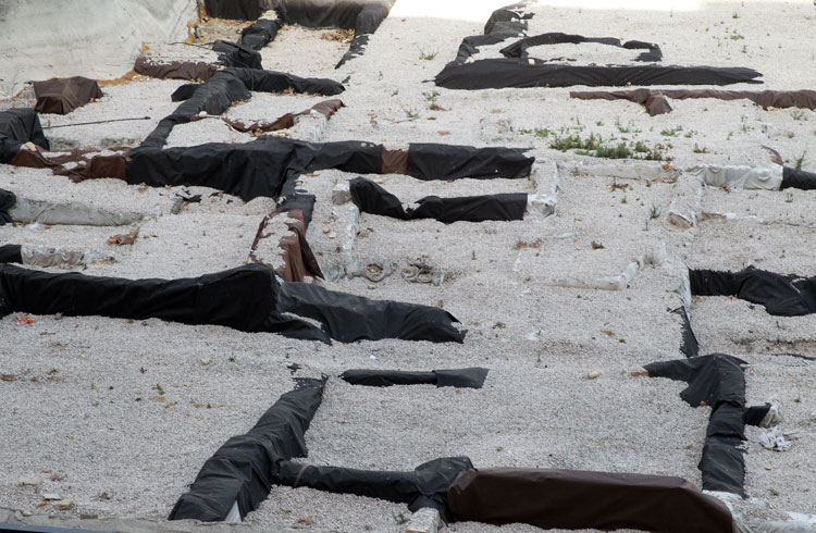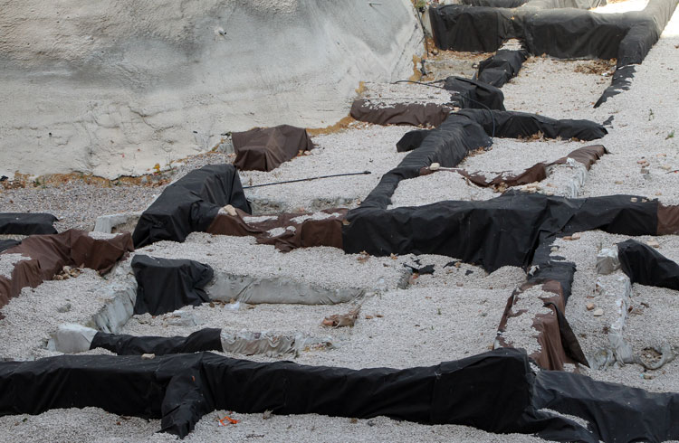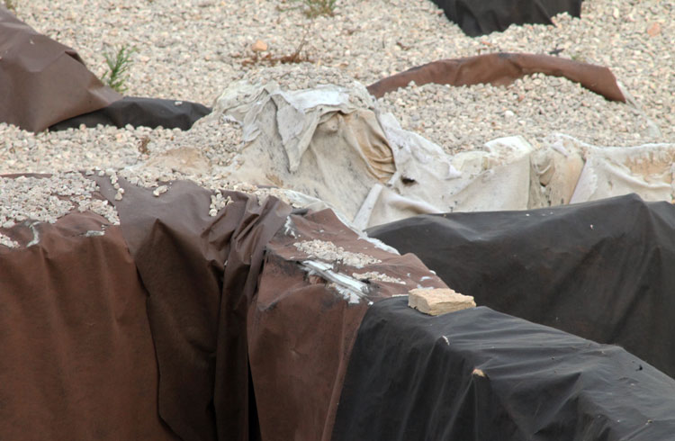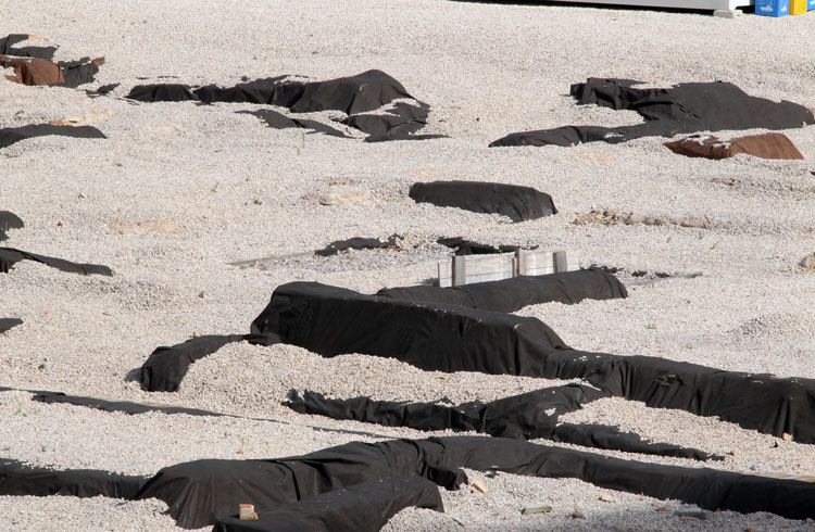 - El yacimiento de San Esteban en Murcia, años tapado con plásticos. Y los trabajos de restauración duran y duran, y nadie sabe cuando acabaran ni el uso último que se le dará. Mientras tanto las hojas secas, y las bolsas de gusanitos se acumulan. Foto Pepe Riquelme.