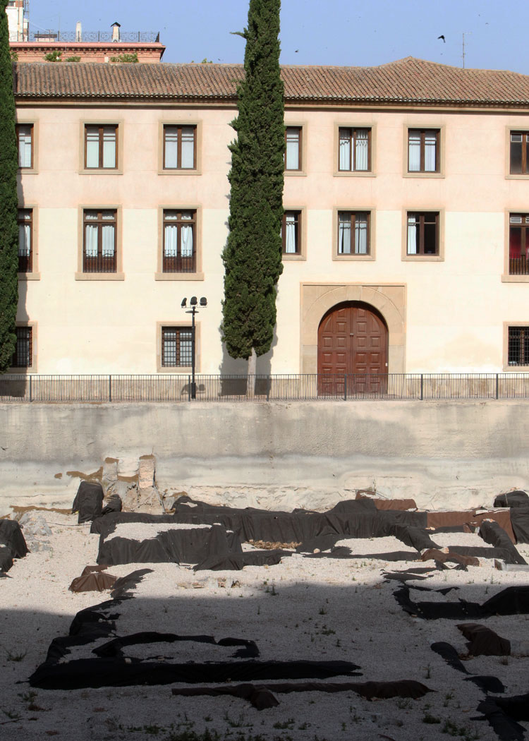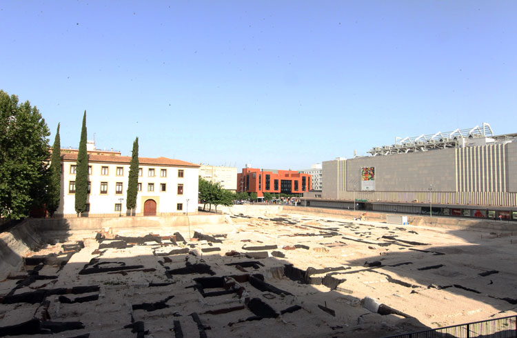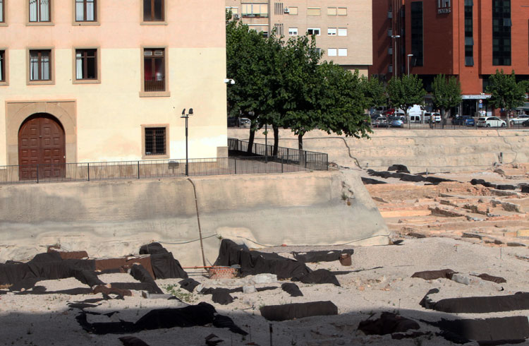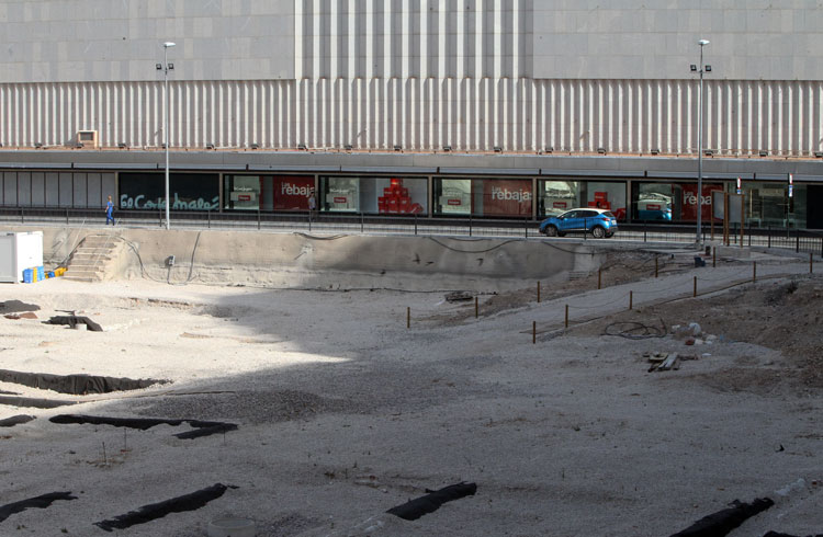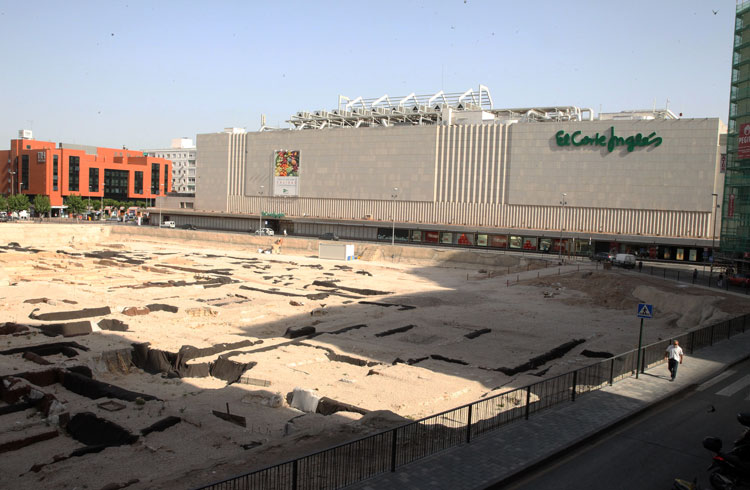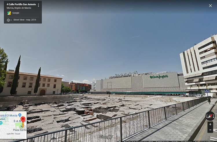 - El yacimiento de San Esteban de Murcia, observado por El Corte Inglés de Murcia, y el Palacio de San Esteban, siempre vigilantes, porque en el subsuelo de ambos, no hay que ser muy espabilado para observar los múltiples restos que también ocultan bajo su hormigón y piedra. Foto Pepe Riquelme.