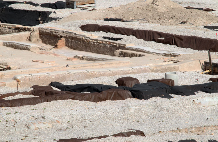 Los restos hallados tapados con eternos plásticos, algunos rotos y otros bastante deteriorados. Esa es la imagen que se llevan los visitantes en loa visitas guiadas al yacimiento.