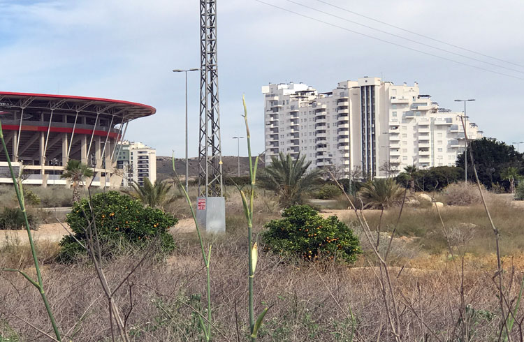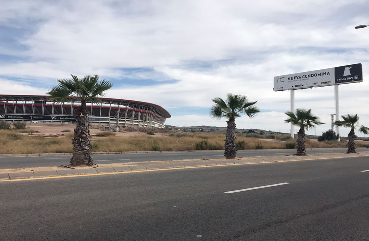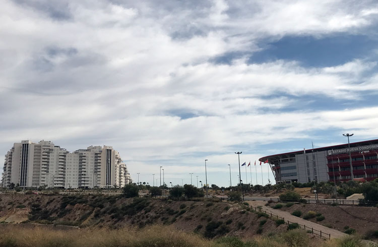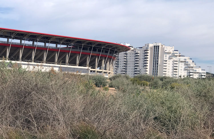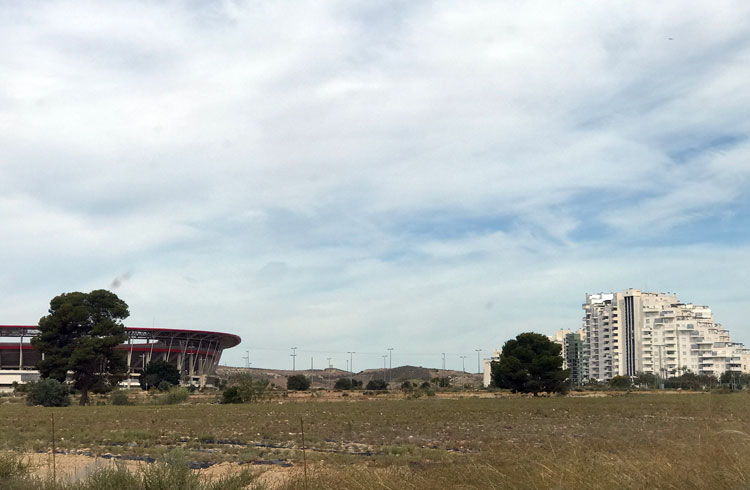 Un autentico secarral rodea las 2 Torres de Nueva Condomina y el estadio que lleva su nombre y en el que juega el Real Murcia. Allí iba un campo de golf, pero ni está ni se le espera. Foto Pepe Riquelme.