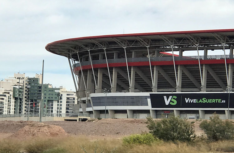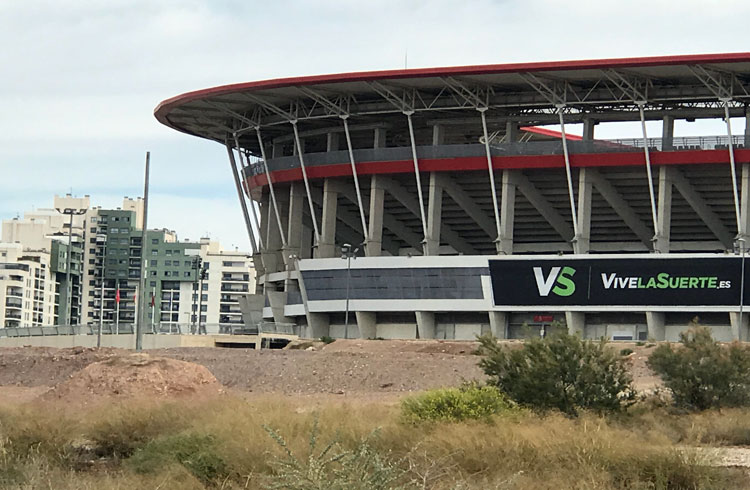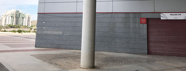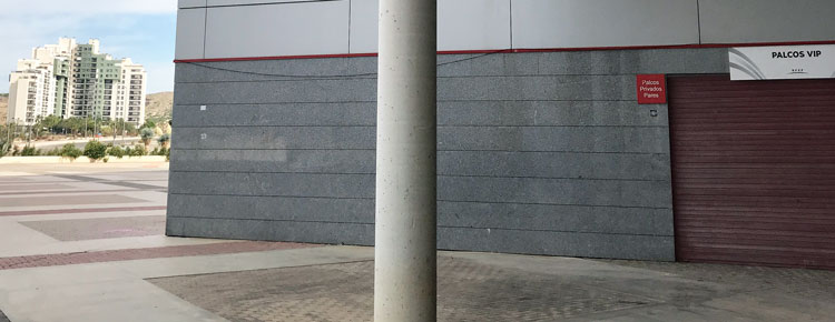 - La entrada a los palcos VIP del Estadio Nueva Condomina, miran mudos, cerrados a cal, sorprendidos y con resignación, a una de las Torres de Nueva Condomina al frente solitaria y en mitad de la nada. Foto Pepe Riquelme.