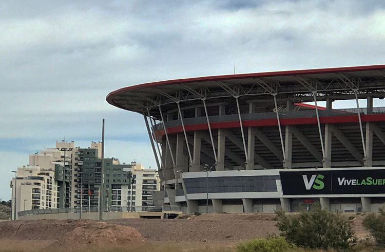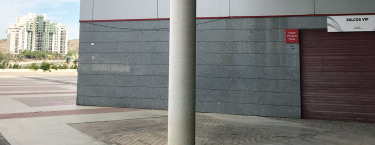 La entrada a los palcos VIP del Estadio Nueva Condomina, miran mudos, cerrados a cal, sorprendidos y con resignación, a una de las Torres de Nueva Condomina al frente solitaria y en mitad de la nada. Foto Pepe Riquelme.