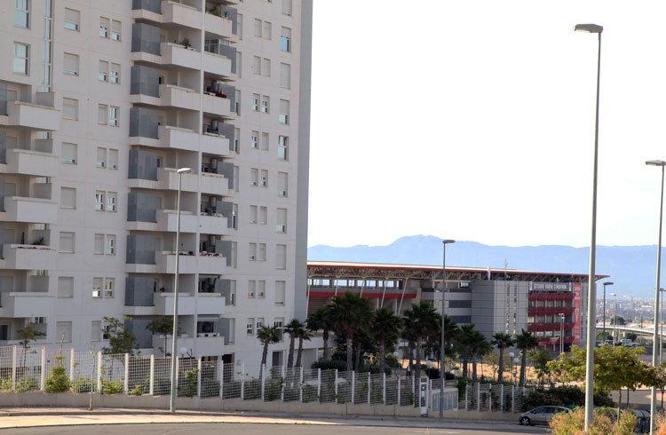 - Las Torres de Nueva Condomina en Murcia y el Estadio que lleva su nombre, mirándose mutuamente frente a frente, preguntándose que no entienden nada. Mientras tanto, el Juzgado, lento pero seguro, tarde o temprano dictará sentencia de este pelotazo inmobiliario. Foto Pepe Riquelme.