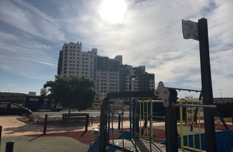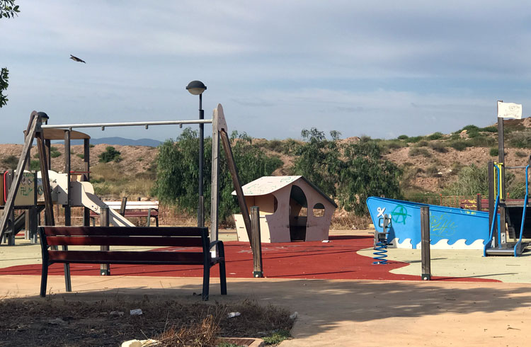 Un parque infantil solitario, frente a las 2 Torres de Nueva Condomina, las mira mudo. El parque lleno de preservativos y botellas de cristal rotas de botellones. Tiene poca pinta de que padres y madres lleven a sus hijos a jugar a dicho parque. Foto Pepe Riquelme.
